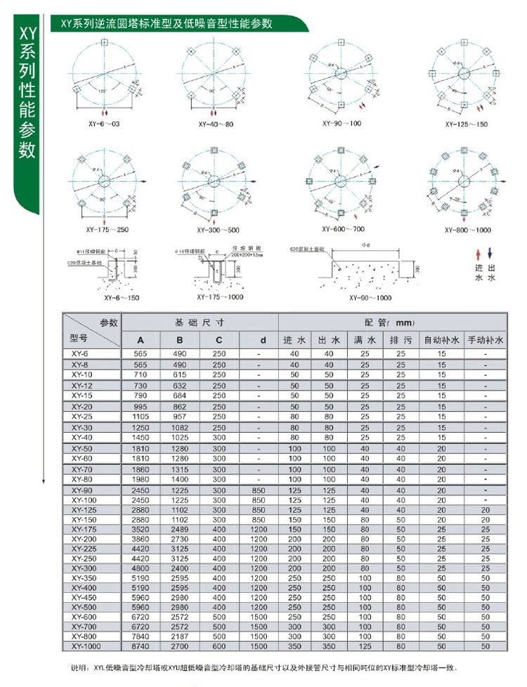 | XY系列逆流圓塔標(biāo)準(zhǔn)型及低噪音型性能參數(shù) |